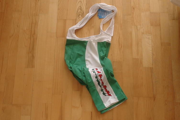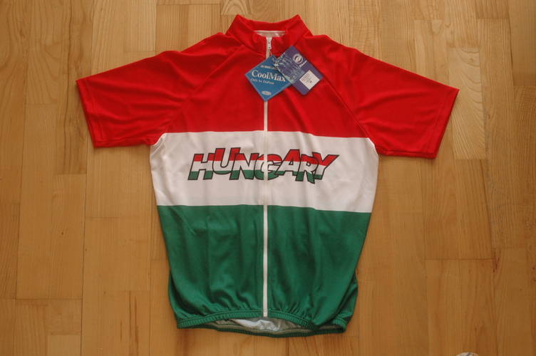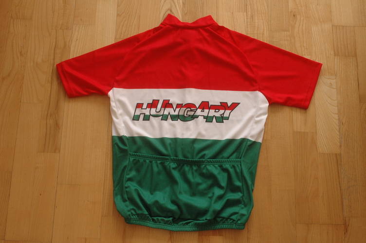 A mez rövid ujjas, piros - fehér - zöld színu, elején, hátulján HUNGARY felirat